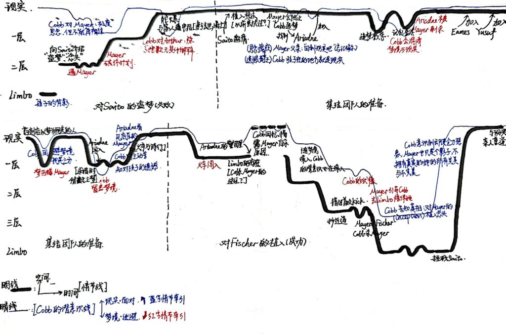 就电影中的时间、空间与系统的关系而言,诺兰也展现出高超的想象力与组织力。时间不再是线性流逝,而是有回忆错落其间,又因梦境的深度而区分出流速,仿佛时间也获得了空间性,可以缩放,可以移动。空间上,现实与多层梦境形成了不同的空间,场景似乎感受不到一种关联性,却正好成为了梦境的佐证,也正是极具差异性的记忆点,让观众得以在紧凑的叙事中快速地定位,意识到现实与梦境、浅梦与深梦正在切换。至于系统,整部电影从剧本、画面、配乐到隐喻、线索,由内而外的一切都可以称之为各部分相互关联、作用的整体,而聚焦于情节,诺兰所构筑的则是一个对“梦境”的解释系统。做梦感受、意识活动、潜意识影响等等事实都被诺兰统合起来,产生体系化的秩序,而这些秩序与规则,在电影中随着叙事的推进,自然地借角色之口引入,又在许多铺垫与呼应中强化:梦境的共享、重叠、坠落,意识的深入、防卫、盗取与植入……时间与空间、图解中展现的双线扰动,自然也是这一系统中不可或缺的组成部分。